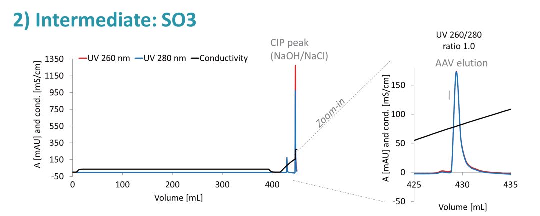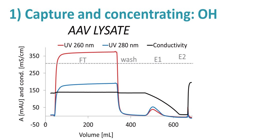 CIMmultus™OH整体柱上的疏水相互作用色谱用于初始病毒捕获和纯化,大多数小分子污染物和蛋白质在flow-through过程中被消除,而AAV与大大减少的污染蛋白质共洗脱。