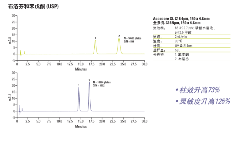Accucore XL C18 键合相的碳载量使其对非极性分析物具有强保留,主要的保留机制是疏水相互作用。 这一特点意味着Accucore XL C18 键合相可用于分离多种分析物。
