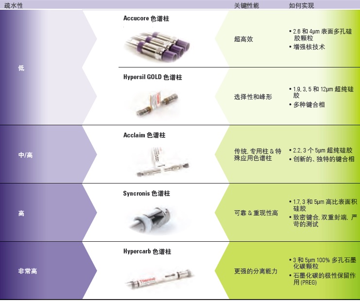 下表展示了我们主要的色谱柱系列,列出了疏水性和关键性能,并解释了这些色谱柱如何实现这些关键性能。使用下表和后文的信息,可以帮助您选择最合适的 Thermo Scientific LC 色柱。
