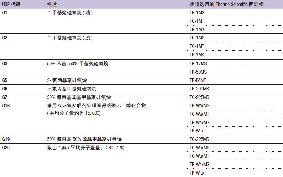 下表中列出了一些USP 规定及其对应的Thermo Scientific GC 色谱柱产品,以方便您选用。在某些情况下,符合要求的固定相可能不止一个。当您存在疑问时,建议您参考原始的完整方法或联系上海精瑞科学仪器有限公司的技术支持团队获取更多信息或帮助,以便选取合适的色谱柱。