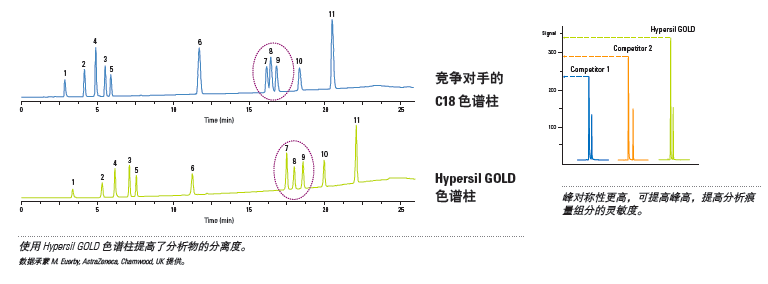 使用 Hypersil GOLD 色谱柱,比竞争对手的 C18 色谱柱具有更高灵敏度,具体见下图。