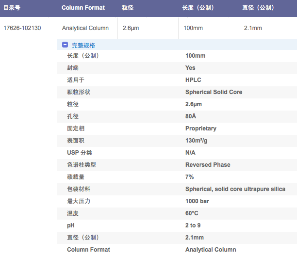英文名称   Accucore RP-MS 100x2.1mm 2.6um LC Column